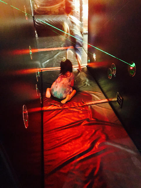 このビームに触れると煙が横の穴からモクモク出てくる!!走り抜ける人が多い中、ムスメはほふく前進で頑張っていました。