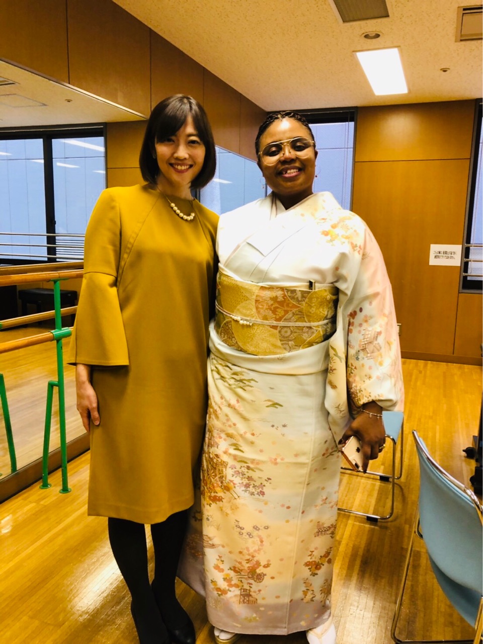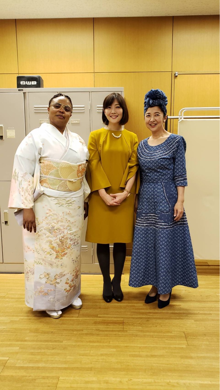 そして右はみなさんご存知、クイズ女王の宮崎美子さんです。宮崎さんは英語と日本語の両方でスピーチをなさいました。素晴らしかったです。そんな宮崎美子さんがお召しになっているのは、モセツェ大使の妹さんが作ったというレソトの伝統的なドレス。モセツェ大使はお着物を。とても喜んでらっしゃって、こちらまで嬉しくなりました。