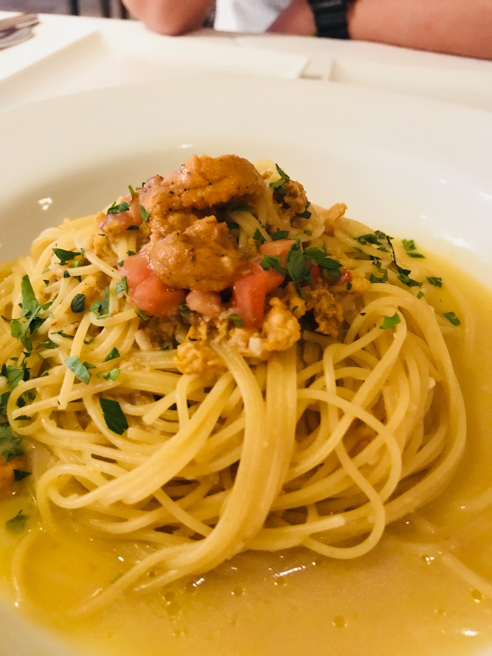 前菜のオイスターに家族全員心を掴まれ、ウニパスタやポモドーロ、トリュフのリゾット、最後は珍しいカニとかが載った生地が薄めのローマ風ピザを食べました。最後の夜だったのもあり、全て激写できました!